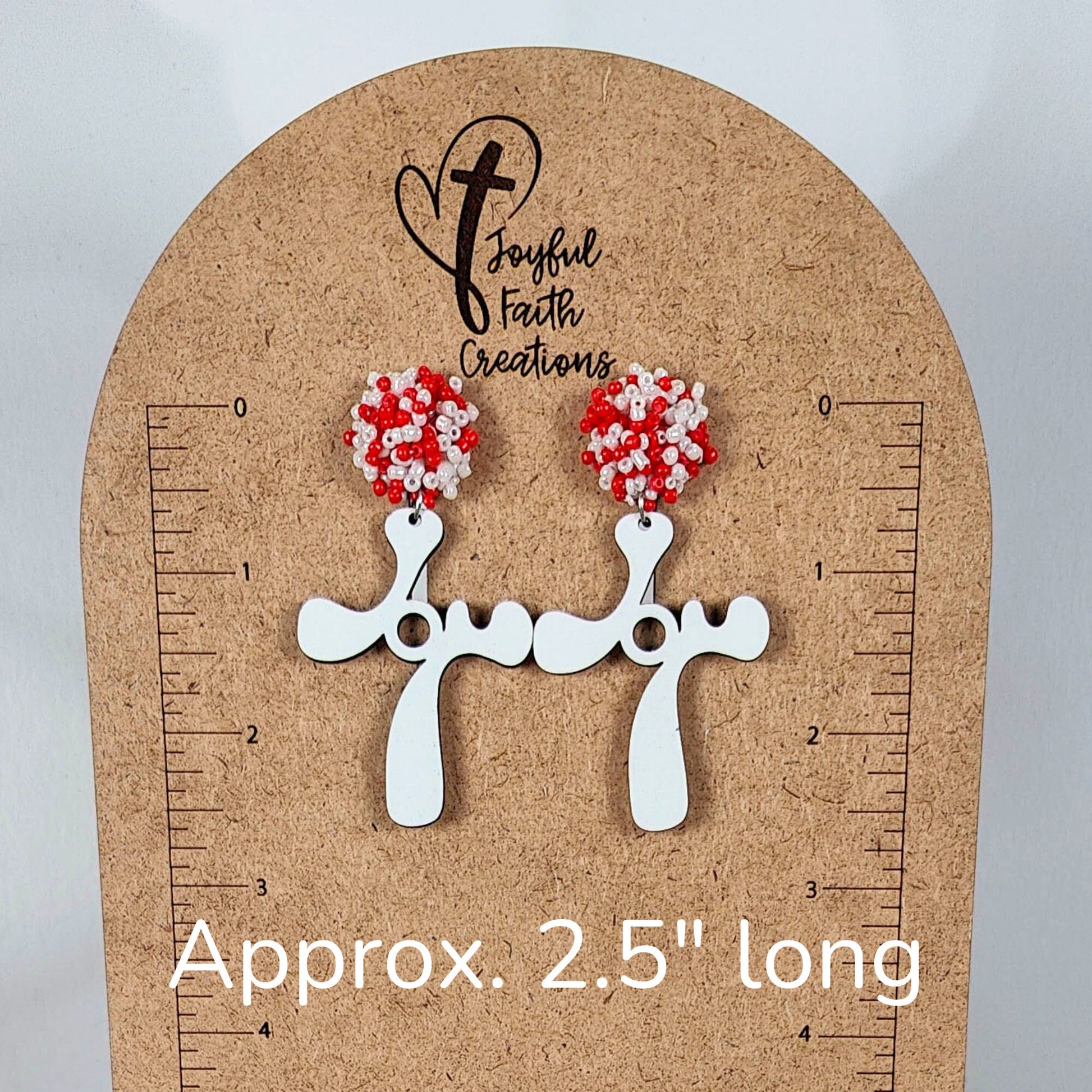 Spread Joy this Christmas season with these white wood earrings with red and white seed bead stud toppers. Makes a great Christmas gift or stocking stuffer.